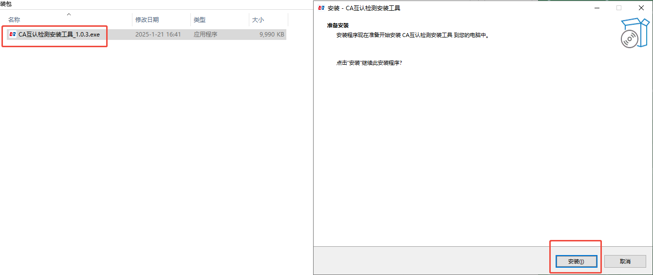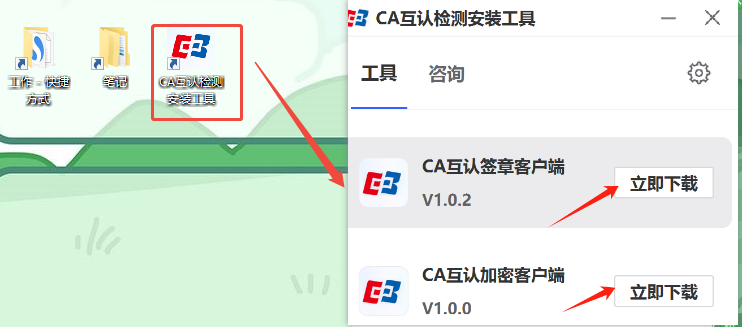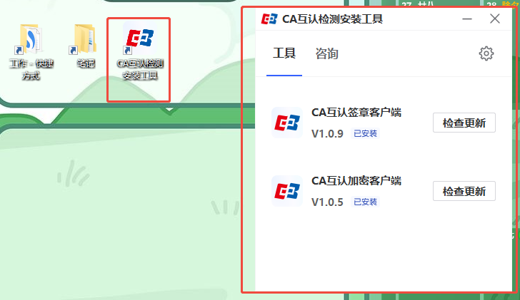 点击安装“CA互认检测安装工具”,安装完成后双击打开,可进行CA互认签章客户端、CA互认加密客户端的下载与检查更新。