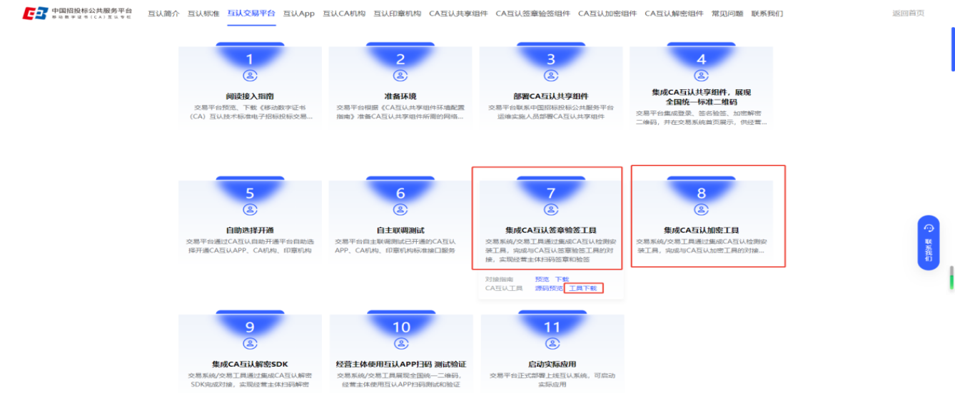 点击“集成CA互认签章验签工具”与“集成CA互认加密工具”,选择点击“工具下载”。
