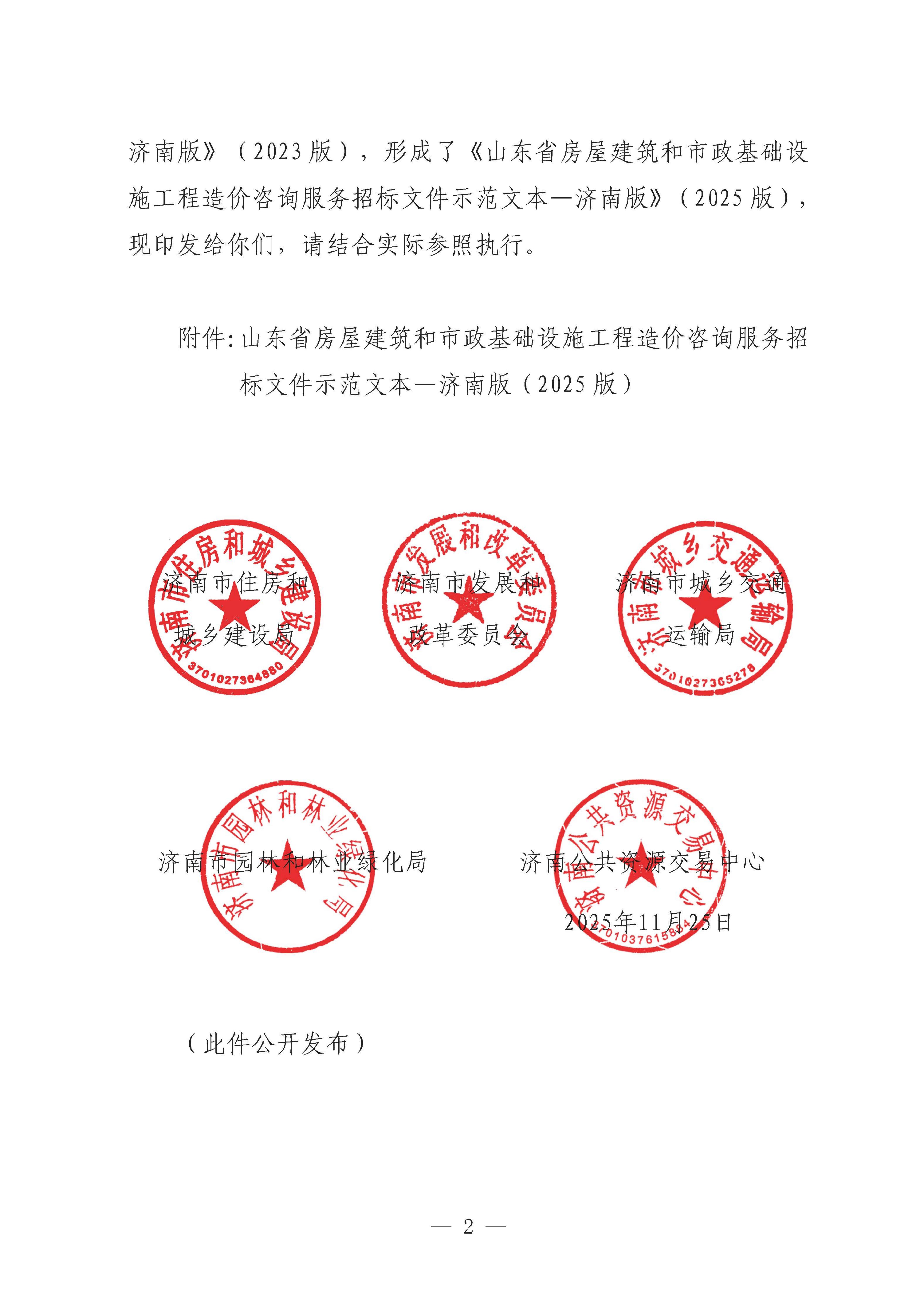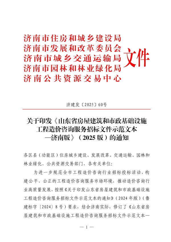 关于印发《山东省房屋建筑和市政基础设施工程造价咨询服务招标文件示范文-济南版》(2025年版)的通知