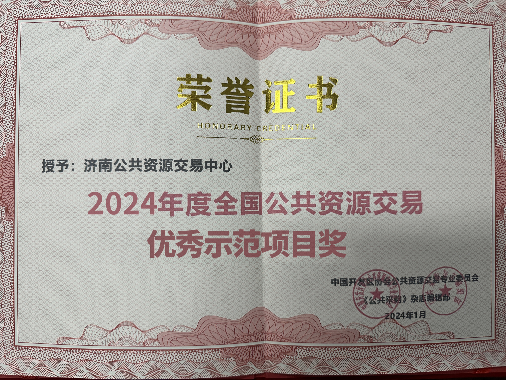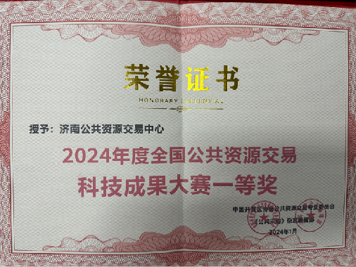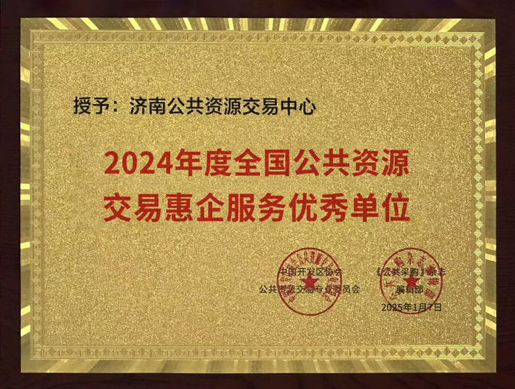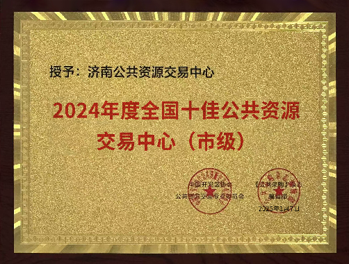 2024年,济南公共资源交易中心致力于推动交易服务机制创新、科技创新,各项工作取得积极成效,相关改革创新做法经过大赛线上投票、论证答辩、路演以及专家委员会评审,从全国150个案例中脱颖而出,分别荣获“2024 年度全国十佳优秀公共资源交易中心”“全国公共资源交易惠企服务优秀单位”“全国公共资源交易科技成果大赛一等奖”“全国公共资源交易优秀示范项目”“全国公共资源交易十佳业务标兵”等荣誉称号,中心主要负责人获评“2024 年度全国公共资源交易杰出人物”。