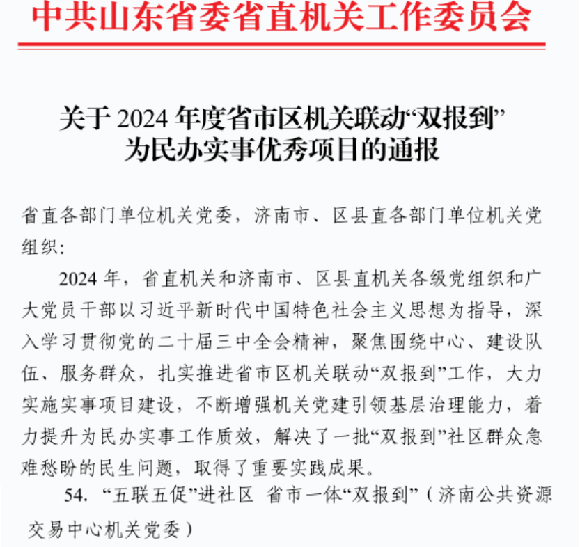 近日,山东省委省直机关工委、济南市委组织部、济南市委市直机关工委等联合发布2024年度省市区机关联动“双报到”为民办实事优秀项目通报,济南公共资源交易中心《“五联五促”进社区 省市一体“双报到”》入选为民办实事优秀项目。