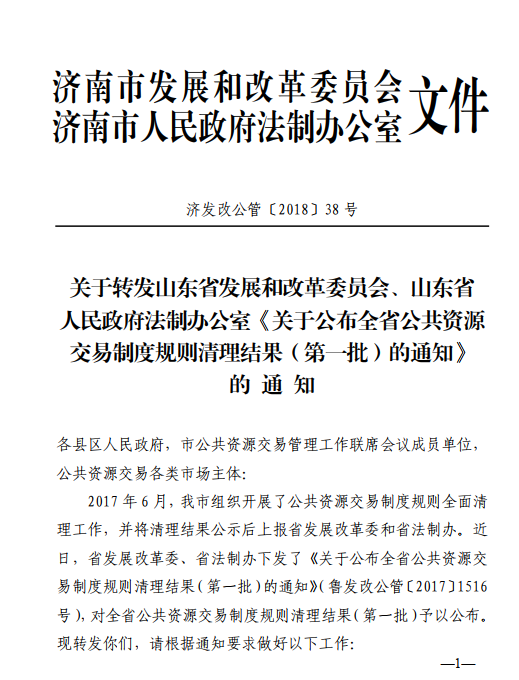 济发改公管〔2018〕38 号关于转发山东省发展和改革委员会、山东省人民政府法制办公室《关于公布全省公共资源交易制度规则清理结果(第一批)的通知》的通知